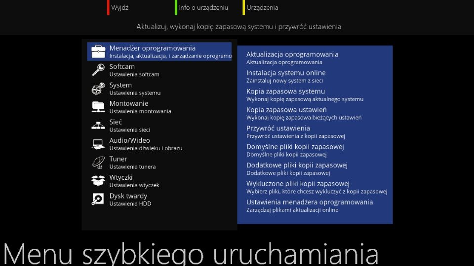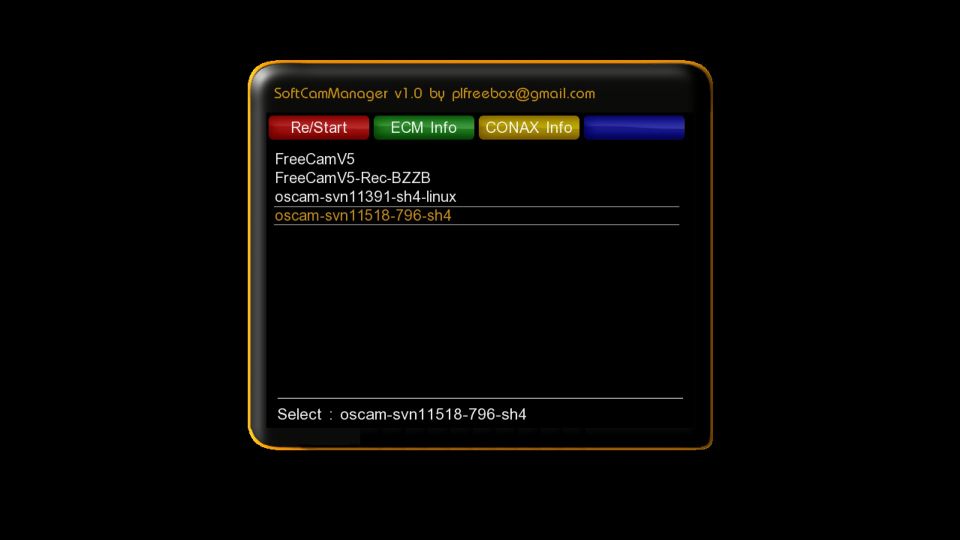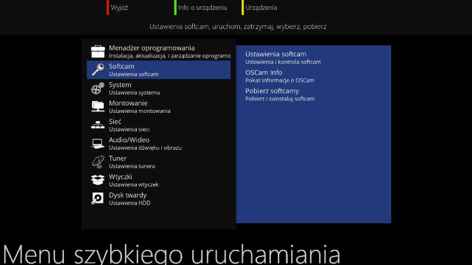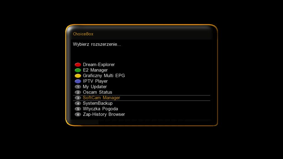 Naciskamy na pilocie niebieski przycisk (ChoiceBox -wybierz rozszerzenie), softcam manager, sprawdzamy czy mamy uruchomione oscam czy freecam (na dole strony select: oscam lub freecam)