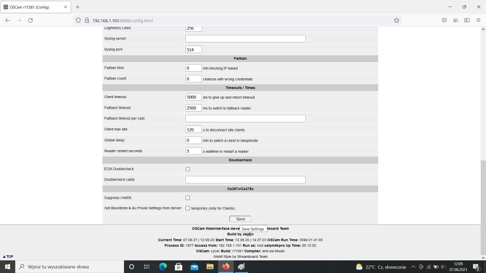 JEŻELI MAMY URUCHOMIONY FREECAM, ZMIENIAMY NA OSCAM 11581, 11518, 11528, 16XX.